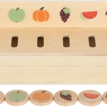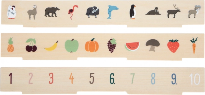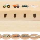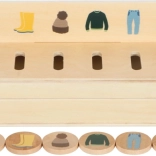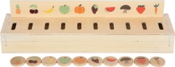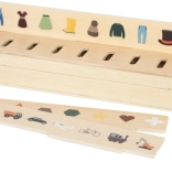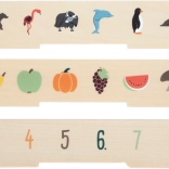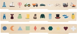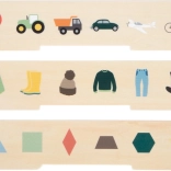 Intelligente giocattolo in legno per bambini dai 3 anni che combina classificazione, inserimento e apprendimento delle parole. Include tre pannelli bifacciali e 60 gettoni illustrati a tema trasporti, animali, numeri, forme, abbigliamento, frutta e verdura. Durante il gioco i bambini sviluppano motricità fine, riconoscimento di colori e forme e in modo naturale ampliano il vocabolario. La conservazione sicura è garantita da una scatola in legno con 10 scomparti e chiusure elastiche – ideale anche in viaggio.