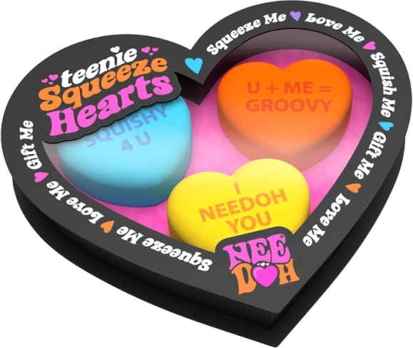 Liberati dallo stress con i cuori antistress Schylling NeeDoh, ideali per il relax e il divertimento. Ogni confezione contiene tre cuori in colori casuali con citazioni motivazionali.