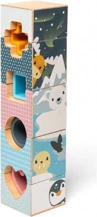 La Torre Artica aiuta a sviluppare le abilità cognitive attraverso pezzi in legno e silicone con decorazioni a tema di animali artici.