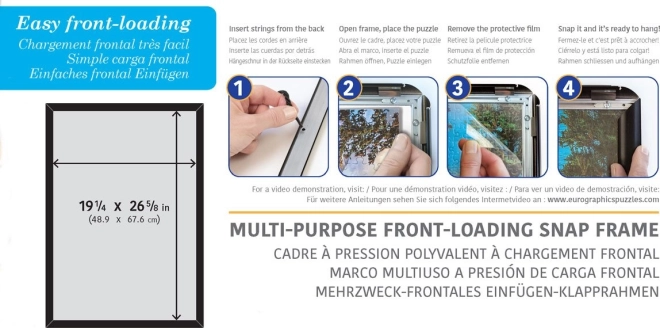 Scopri il modo efficiente per esporre i tuoi puzzle con le cornici a scatto Eurographics. Questa cornice innovativa è progettata per puzzle di dimensioni 48,89 x 67,63 cm, includendo vari tipi di puzzle come Eurographics 1000 pezzi o Eurographics XL 500 pezzi. Con la possibilità di appendere sia in verticale che in orizzontale, offre opzioni di posizionamento flessibili.