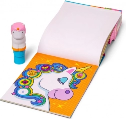 L'immagine mostra un libro da colorare e timbro destinato a bambini che supportano la creazione creativa.