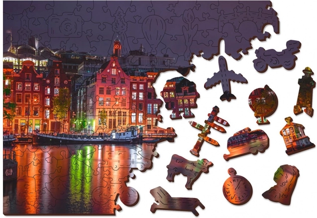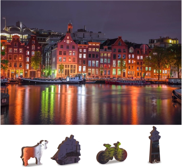 Ogni pezzo è sia parte del tutto che ha una sua forma unica rappresentando edifici urbani, animali o oggetti. Inoltre, l'assemblaggio è più impegnativo, il che contribuisce a un maggiore divertimento e sfida. Il puzzle è anche decorato con un affascinante scenario di Amsterdam di notte, perfettamente inciso su ogni pezzo.