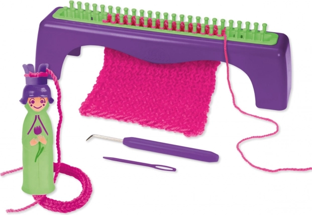 - Dotazione completa: bambolina per la maglia, tavolo per la maglia, uncinetto, ago in plastica e filato