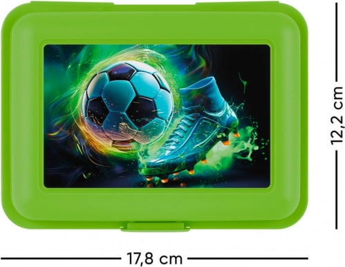 Pratico porta-pranzo di colore verde con motivo a pallone da calcio, ideale per la scuola e le gite. Offre una chiusura sicura con un unico fermaglio, un divisorio rimovibile per una migliore organizzazione ed è realizzato in plastica resistente.