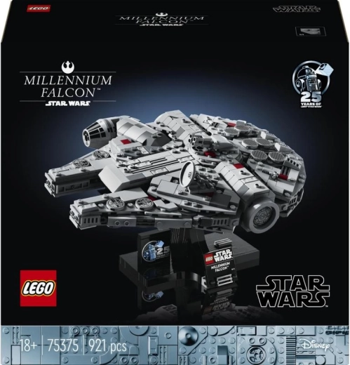 La base stabile presenta il Millennium Falcon in volo e include una targhetta stampata più il mattoncino per il 25º anniversario di LEGO Star Wars.