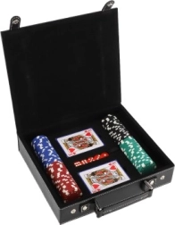 Il set comprende 100 gettoni, 2 mazzi di carte e 5 dadi – la base ideale per un torneo di poker domestico senza acquisti aggiuntivi.