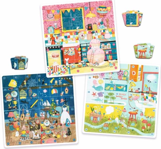 Il gioco include tre diverse plance tematiche: Bagno, Cucina e Soffitta. Ciascuna di queste plance offre diversi livelli di difficoltà, così puoi scegliere in base alla composizione dei giocatori e alle loro abilità. Il narratore mette in mostra le proprie capacità descrivendo le carte piccole, affinché gli altri possano trovare la posizione corretta sulle grandi plance di gioco.