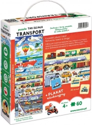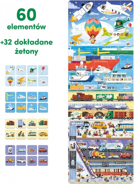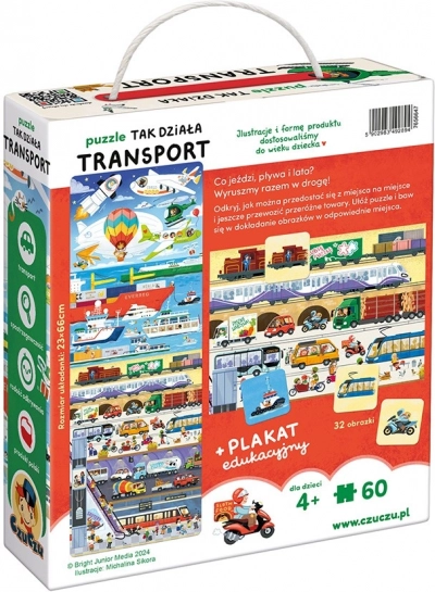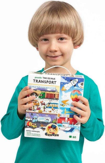 Il puzzle Così funziona il trasporto è un set educativo unico per i bambini in età prescolare, soprattutto se amano i diversi veicoli. È composto da un puzzle da 60 pezzi, 32 immagini corrispondenti e un poster educativo. Divertiamoci! Presta attenzione a ciò che viaggia sulla strada, naviga sull’acqua e vola in aria. Mezzi di trasporto noti e amati, ma anche meno evidenti, sono un’ottima motivazione al gioco. Assemblando il puzzle, i bambini sviluppano in modo divertente l’osservazione, la pazienza e acquisiscono nuove conoscenze. Buon divertimento!