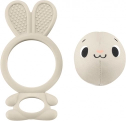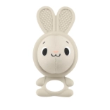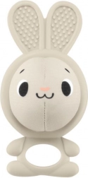 Coniglietto in silicone con orecchie testurizzate e foro per una presa sicura del bebé. La sferetta tintinnante removibile motiva al movimento e sviluppa la motricità fine.