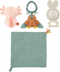 Scoprite il divertimento sensoriale per i neonati con il set regalo FISHER‑PRICE Mondo dei sensi. Nella confezione trovate 4 adorabili giochi: mordicchiatore a forma di coniglietto in silicone senza BPA, morbido axolotl con campanellino, sonaglino tattile a farfalla con clip e morbido pannello frusciante con nastro. I giochi sono facili da afferrare dalle piccole manine, favoriscono la motricità fine e lo sviluppo di vista, udito e tatto. La clip permette di agganciare al passeggino, alla borsa o al tappeto gioco, così li potrete usare anche in viaggio.