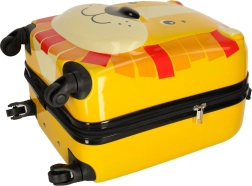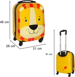 Adorabile valigia per bambini con motivo del leone, ideale come bagaglio a mano per i piccoli viaggiatori. Presenta un robusto design rigido in plastica, quattro ruote per una guida facile e un manico telescopico. All'interno offre due scomparti – una tasca con zip e una sezione con cinghie incrociate – così ci stanno comodamente vestiti e giocattoli preferiti.