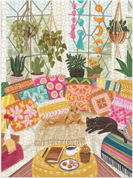 Un elegante puzzle con il motivo di due gatti in un paradiso di tessili artigianali e piante da interno: scelta perfetta per momenti di tranquillità o come regalo originale. Grazie alla stampa di alta qualità con inchiostri atossici e alla finitura opaca, risaltano i dettagli e la fedeltà cromatica.