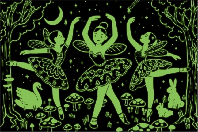Componi una scena di ballo straordinaria direttamente dal Lago dei Cigni con un puzzle che brilla al buio! Include 100 pezzi con eleganti ballerine che al buio si trasformano in fate su una radura incantata.