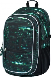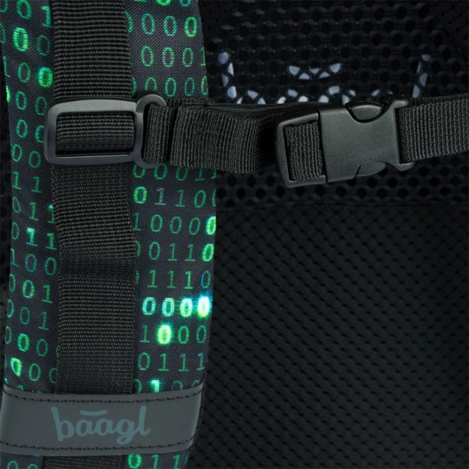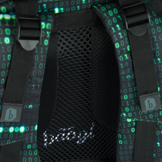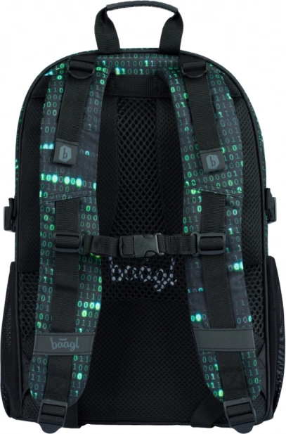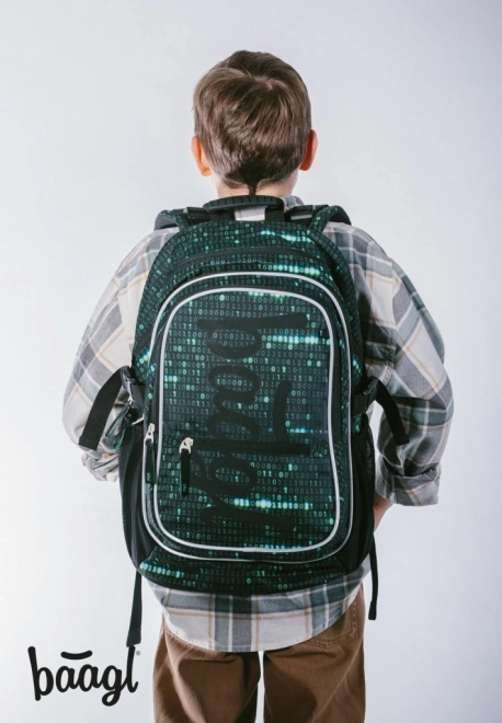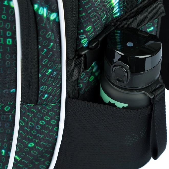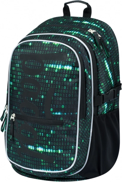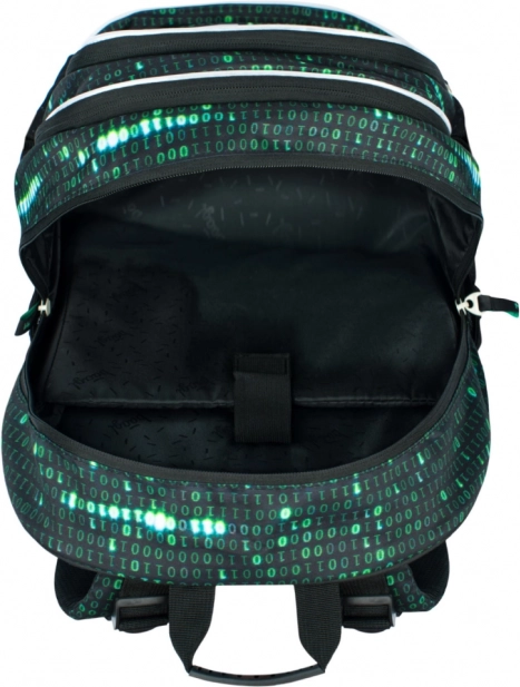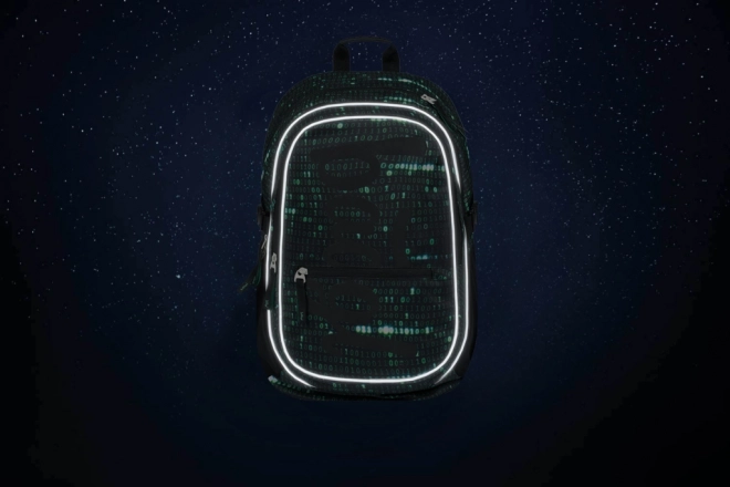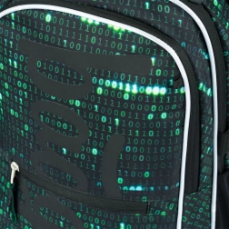 Questo zaino si distingue per un design unico con un motivo di codice binario nei colori verde e nero, che cattura l'attenzione di ogni studente appassionato di tecnologia.