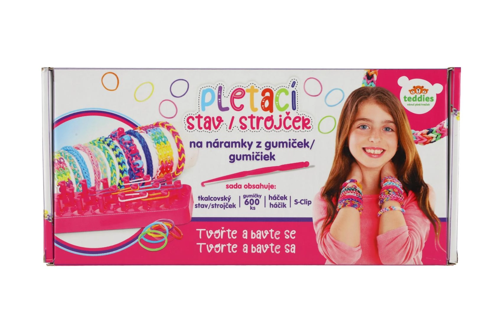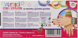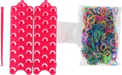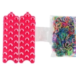 - 600 elastici in silicone (mix di colori), telaio a tre file, uncinetto, clip di chiusura, istruzioni