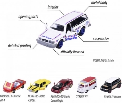 Nella collezione trovi leggende come CITROËN HY (1968), MERCEDES-BENZ 450 SEL (1975), VOLVO 240 GL (1985), CHEVROLET CORVETTE ZR-1 (1990) e ALFA ROMEO GIULIA (2015).