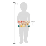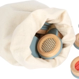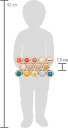 Il set include 28 dischi in legno con inserti colorati e ben percepibili al tatto e un sacchetto in tessuto per riporli. Grazie alle dimensioni compatte, il gioco è perfetto anche in viaggio: a casa, all’asilo o nell’area bimbi.