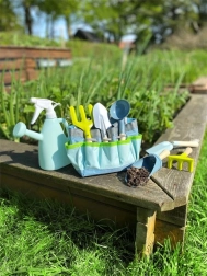 Sei utensili robusti (palette, zappetta, cucchiaio dosatore, rastrellino e forche) con manici in legno sono pensati per i piccoli giardinieri.
