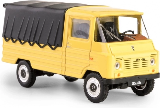 Scopri la leggenda in formato tascabile: il modello FSC Żuk, ispirato al celebre veicolo commerciale polacco prodotto a Lublino. Questo pezzo da collezione nel vivace colore giallo con telone nero riproduce fedelmente l’aspetto e le proporzioni dell’originale, inclusi i dettagli della cabina, delle ruote e della calandra.