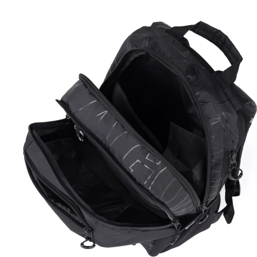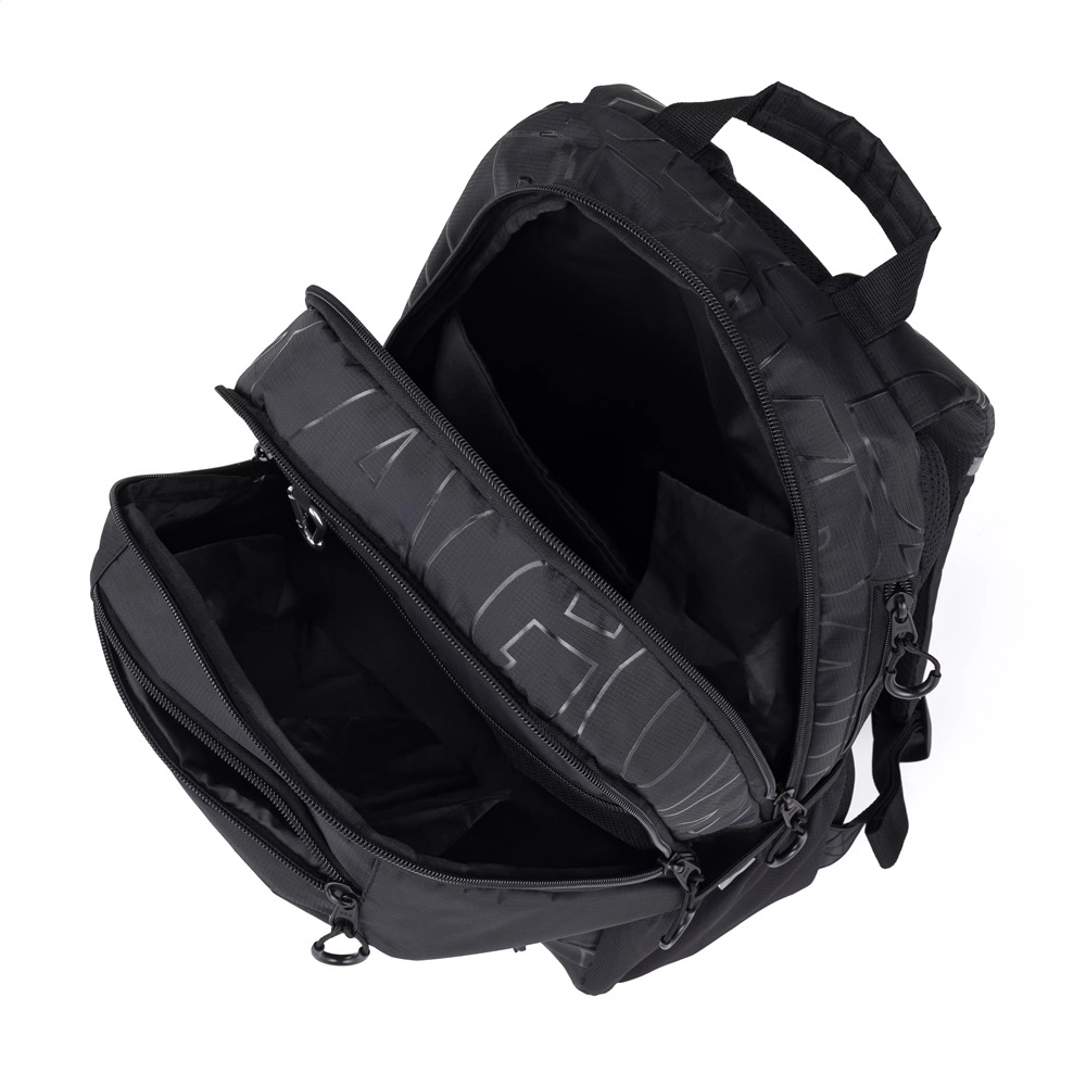 - 2 scomparti principali, tasca frontale, tasca rinforzata per laptop, tasca per piccoli oggetti, moschettone portachiavi, tasca nascosta sul retro, tasca laterale per borraccia