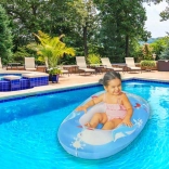 La pavimentazione gonfiabile e il bordo morbido su tutto il perimetro garantiscono sicurezza e comfort. Il pratico cordino di traino permette ai genitori di avvicinare o guidare il gommone in acque basse. Nella confezione è inclusa anche una pezza di riparazione.