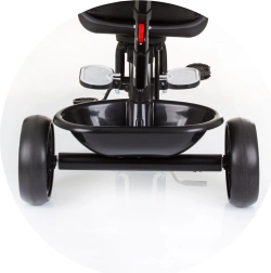 La sicurezza è al primo posto: il triciclo dispone di barra di protezione rimovibile, cinture di sicurezza e struttura stabile. I genitori apprezzeranno il maniglione regolabile, le pedane pieghevoli e i pratici cestini anteriore e posteriore. Quando il bambino è pronto, barra e maniglione con cappottina possono essere rimossi e il piccolo pilota può pedalare in autonomia.