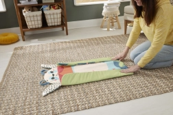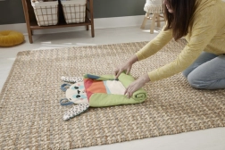 Il tappetino è realizzato con tessuto contenente il 90% di plastica riciclata ed è fornito in confezione certificata FSC. Grazie alla soluzione intelligente lo arrotoli, lo fissi con le “zampette” e lo porti con te in viaggio. I giochi rimovibili si agganciano facilmente ai passanti, così il gioco è sempre nuovo e stimolante.