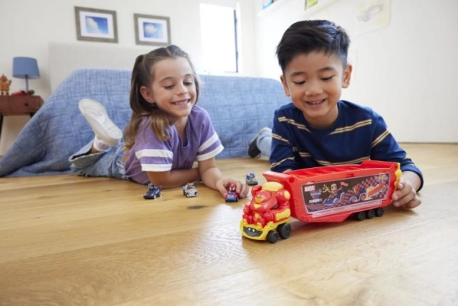 I bambini possono sganciare la cabina anteriore e usarla per giocare separatamente. Sollevando il casco si rivela la minifigura fissa di Tony Stark sul sedile del guidatore, che stimola storie e scenari creativi. Il trasportatore contiene fino a 10 macchinine Hot Wheels RacerVerse o modelli standard Hot Wheels in scala 1:64.