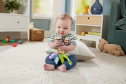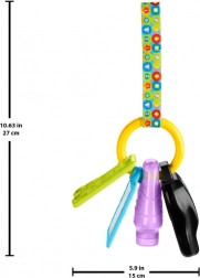 Ogni ciondolo sull’anello offre una diversa esperienza: la chiave musicale attiva suoni di veicoli, canzoncine e frasi; la boccetta da premere stimola il tatto; lo specchietto invita all’auto-scoperta e il mordicchiatore con texture allevia il fastidio della dentizione. Grazie al design leggero, il giocattolo è ideale per passeggino, auto e gioco in casa.