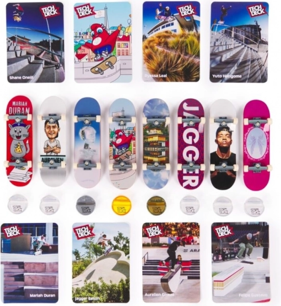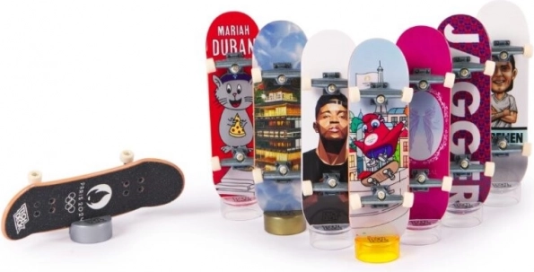 Ogni fingerboard in questa collezione ha un design autentico di aziende di skateboard di fama mondiale. Sono incluse anche 8 carte da collezione che mostrano skateboarder selezionati in acrobazie. Metti i tuoi fingerboard su supporti con porta d'oro, argento e bronzo e mostra i tuoi tesori con orgoglio.