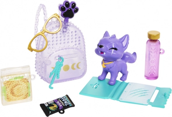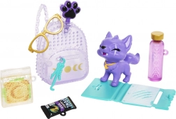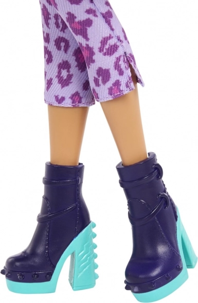 Il look “artigliato” comprende una giacca pelosa viola, pantaloni con stampa leopardata, completati da collana, cintura e scarpe con zeppa. Il ricco set di accessori – zaino, occhiali, borraccia, snack e barretta, organizer e spazzola per l’animaletto – favorisce il gioco immaginativo e l’esposizione su uno scaffale.