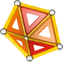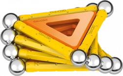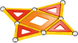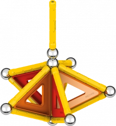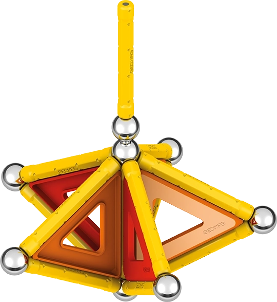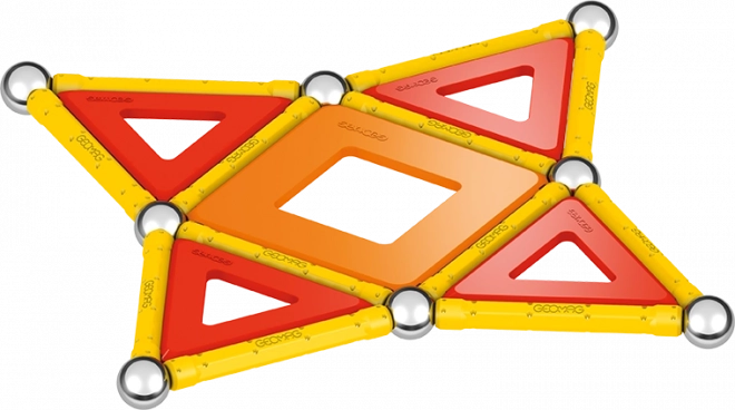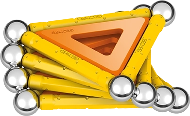 Cosa c'è nella confezione: 12 barre magnetiche gialle, 12 sfere in acciaio, 8 pannelli triangolari, 2 pannelli quadrati, 1 pannello arancione a forma di pentagono e un box di plastica per sfere e barre.