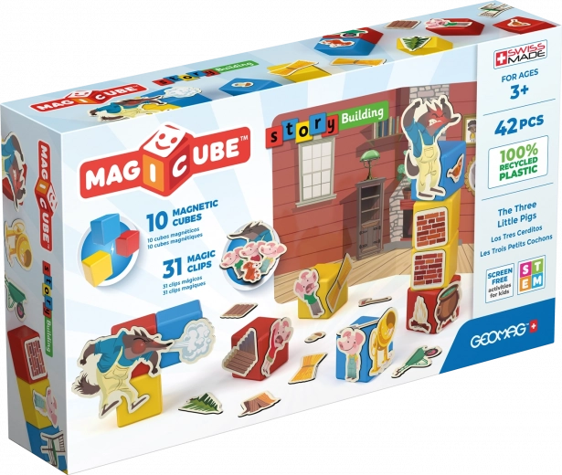 Il set include 10 solidi cubi magnetici e 31 clip illustrate con i porcellini, il lupo e la costruzione delle casette, così i piccoli creatori possono raccontare la storia conosciuta o inventarne di nuove. I materiali sono atossici e realizzati con la tipica precisione svizzera del marchio Geomag.