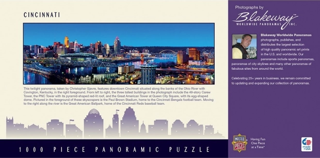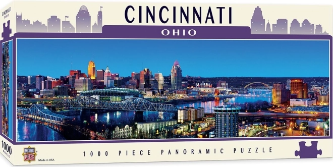 Scopri la bellezza della metropoli americana con il puzzle panoramico MASTERPIECES “Cincinnati, Ohio” da 1000 pezzi. La serie Cityscapes offre colori vivaci, lavorazione precisa e pezzi robusti che si incastrano perfettamente. Realizzato con materiale riciclato e riciclabile.