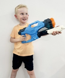 La struttura in plastica resistente, l’impugnatura ergonomica e il grilletto fluido garantiscono un uso confortevole e sicuro. Il design futuristico in blu e nero conquisterà piccoli e grandi e incentiverà il movimento attivo all’aria aperta.