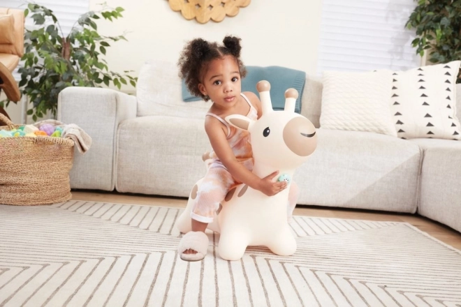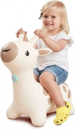 Allegra giraffa Jumper realizzata in morbida gomma al tatto, sicura per il bambino. Premendo il pulsante si attivano 3 melodie e 1 effetto sonoro. Il saltello può essere sia un giocattolo sia un attrezzo per esercizi ginnici. La pompa è inclusa nella confezione.