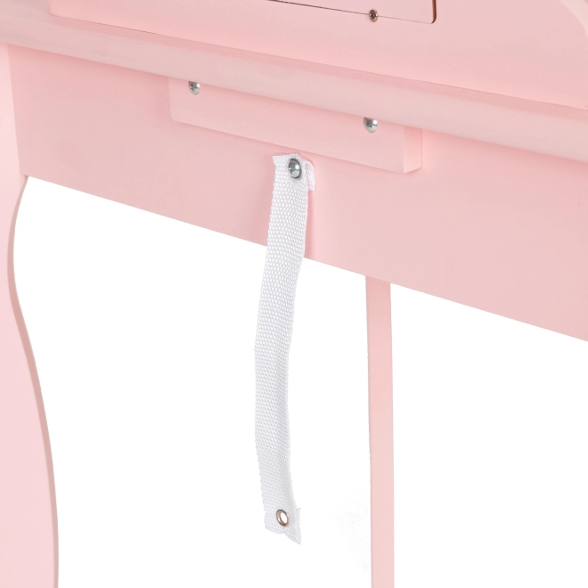 Il punto forte del tavolo è lo spazioso specchio dalla forma aggraziata con cuoricino, che dona fascino alla stanza e permette ai bambini di sistemarsi comodamente e giocare al salone di bellezza.