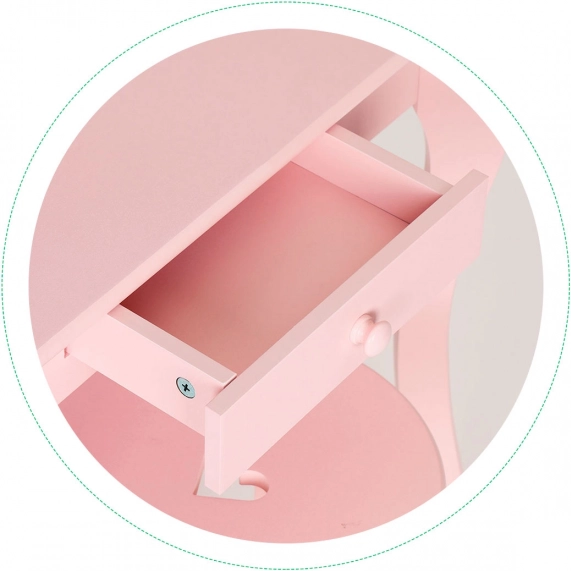 Questa incantevole toeletta rosa per piccole appassionate di bellezza crea nella cameretta un angolo tutto loro. L'ampio piano di lavoro e il cassetto per tesori, gioielli e accessori mantengono tutto ben organizzato e a portata di mano, mentre il grande specchio con dolce cuoricino dona fascino all'intero set.