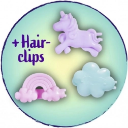 Evi ha lunghi capelli rosa e fermagli colorati a forma di nuvola, arcobaleno e unicorno per acconciature infinite.