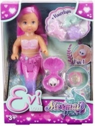 La bambola Evi come sirena delle perle incanta i bambini con la sua coda viola e i lunghi capelli rosa, che possono essere acconciati con i fermagli inclusi a forma di nuvola, arcobaleno e unicorno. È inclusa anche una perla magica, da inserire nell’anellino per bambini e trasformarla in un gioiello incantato.