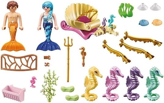 Immergiti nelle profondità dell’oceano e vivi la fantasia al massimo. Questo set riccamente dettagliato offre un carro sottomarino scintillante, quattro grandi cavallucci marini e due figure di fate marine. La serie PLAYMOBIL Princess Magic stimola il gioco creativo e la narrazione di storie per bambini dai 4 anni in su.