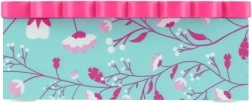 Il corpo turchese con fiori e il coperchio rosa creano un accessorio giocoso ma elegante per la cameretta e la zona notte.