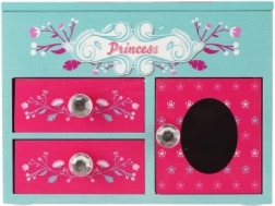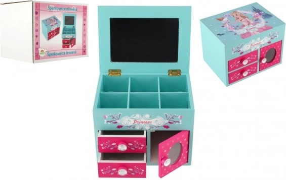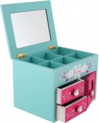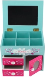 Questa deliziosa scatola portagioie in legno, nei toni turchese e rosa con motivi di principessa e fiori, è la soluzione ideale per organizzare anellini, orecchini, braccialetti e piccoli segreti. Sotto il coperchio ribaltabile con specchietto troverai scomparti suddivisi per un colpo d’occhio quotidiano e una scelta rapida.