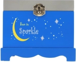Il design con la scritta “Born to Sparkle”, stelline e luna risulta giocoso e decorativo. Grazie alle dimensioni compatte, il portagioie si adatta sia al comò sia alla mensola e diventa una splendida decorazione per la cameretta.