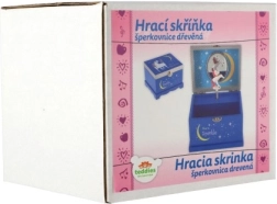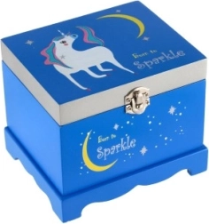 Un magico portagioie musicale per piccole appassionate di eleganza, in un raffinato colore blu. All'interno troverai uno specchietto e un unicorno rotante che, dopo aver caricato la chiavetta, suona una melodia. Realizzazione in legno, custodia sicura per gioielli e piccoli tesori e un design giocoso con stelle e luna lo rendono un accessorio ideale per la cameretta.