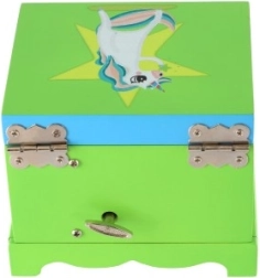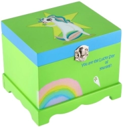 La struttura in legno resistente con chiusura in metallo e il grazioso motivo con unicorno e arcobaleno si adattano a qualsiasi cameretta. Le dimensioni compatte permettono di posizionare il portagioie su mensole o cassettiere, offrendo al contempo spazio sufficiente per anellini, orecchini e piccoli souvenir.