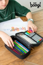 L’astuccio scolastico BAAGL Darkness, elegante e resistente, offre un’organizzazione pratica delle forniture per la scuola e l’ufficio. Dispone di un’aletta ribaltabile, tasca interna con cerniera, tasca per l’orario e cerniere YKK di alta qualità. È realizzato in materiale riciclato e viene fornito senza contenuto.