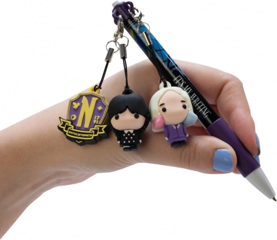 Questa penna porta un valore da collezione con il tema del personaggio Wednesday e i ciondoli che ne fanno un pezzo da collezione affascinante.