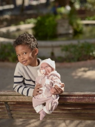 Il corpicino in cotone e gli arti in vinile sono accompagnati da un abbigliamento in quattro pezzi, un cuscinetto e un ciuccio: tutto pronto per giocare subito.