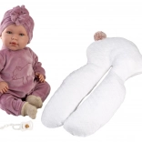 Include un completo di abbigliamento in quattro pezzi, un morbido cuscinetto e un ciuccio con clip per calmare la bambola.